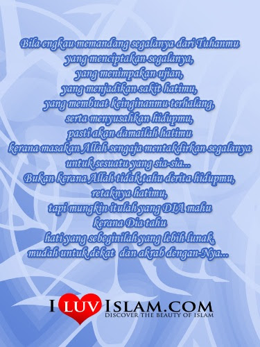kita sebagai manusia selalu lupa pd Dia... bila datag sikit dgaan mula la kita merungut kita kata mcm2..Allah tak sayang kita la.. Allah nie tak adil la.. tp cuba kita lihat semula bila Allah datang kebahagiaan dn kesenangan pulapada kita.. pernahkah kita mngucap kn syukur?? klau ada pn mugkin skali dua je lepas tu trus dh tak ingat apa2... mcm yg sy kata semua nie hanya berlaku pada segelintir hamba-Nya sahaja.. mungkin juga aku tergolong dlm hmba yg mcm nie... erm ntah la... amalkan sikap husnudzon bukan hnya kpd mnusia tetapi juga pada Allah... jgalah hablu minannas dn juga hablu minallah sebaik - baiknya..